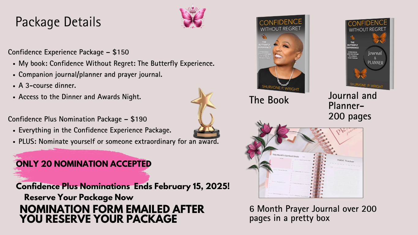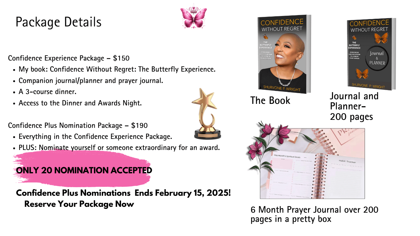 As a bestselling author, my books reflect my commitment to transformation and purpose. My signature work, Confidence Without Regret: The Butterfly Experience, chronicles my own journey of overcoming low self-esteem to live boldly and intentionally. This book, along with its companion journal and planner, serves as a guide for others ready to step into their confidence and build lives of purpose.