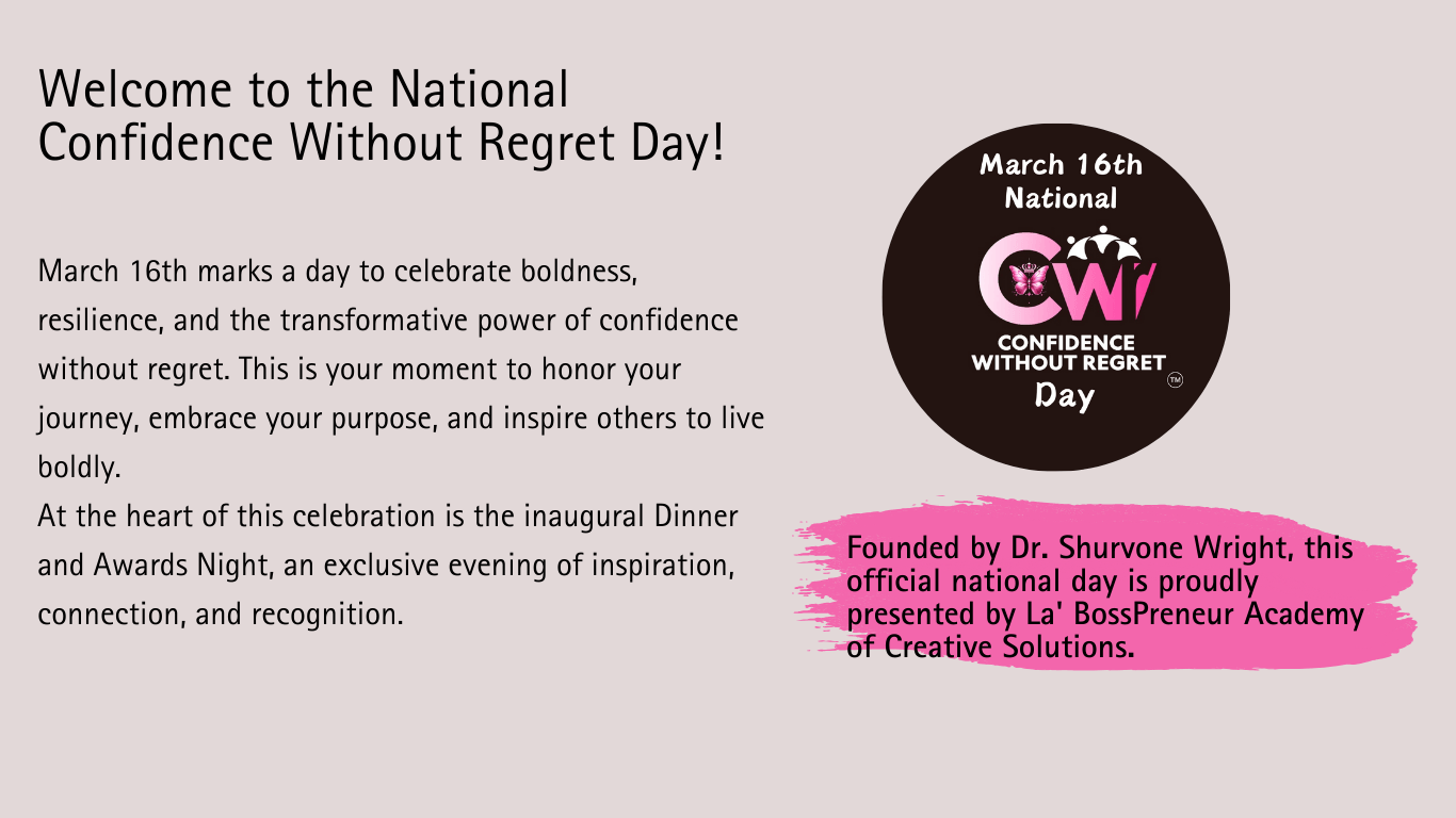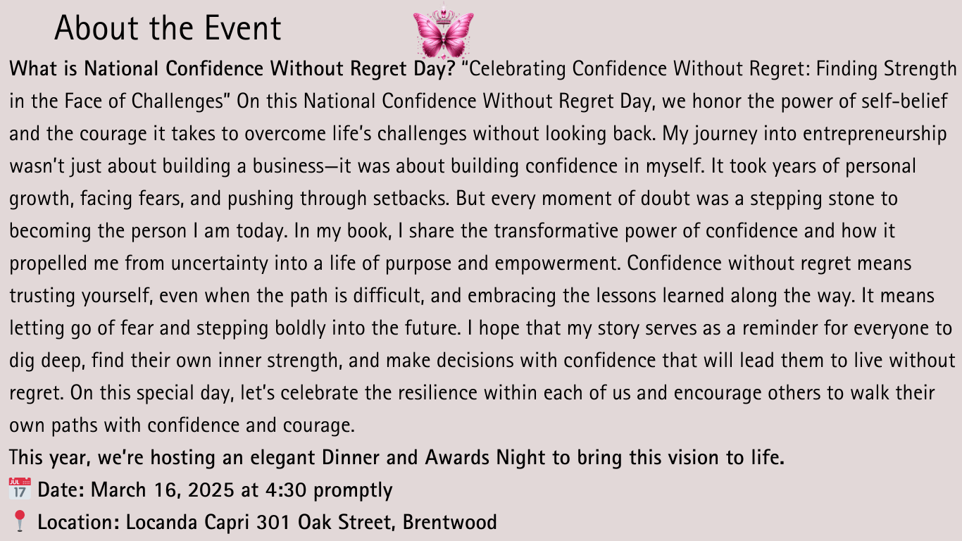 This journey—spanning ministry, community service, and entrepreneurship—has taught me the power of faith, resilience, and intentional action. National Confidence Without Regret Day represents what’s possible when personal growth turns into collective empowerment. After more than two decades of entrepreneurship, I’ve learned that confidence isn’t just about how you feel—it’s about the decisions you make to step forward, serve others, and leave a lasting legacy